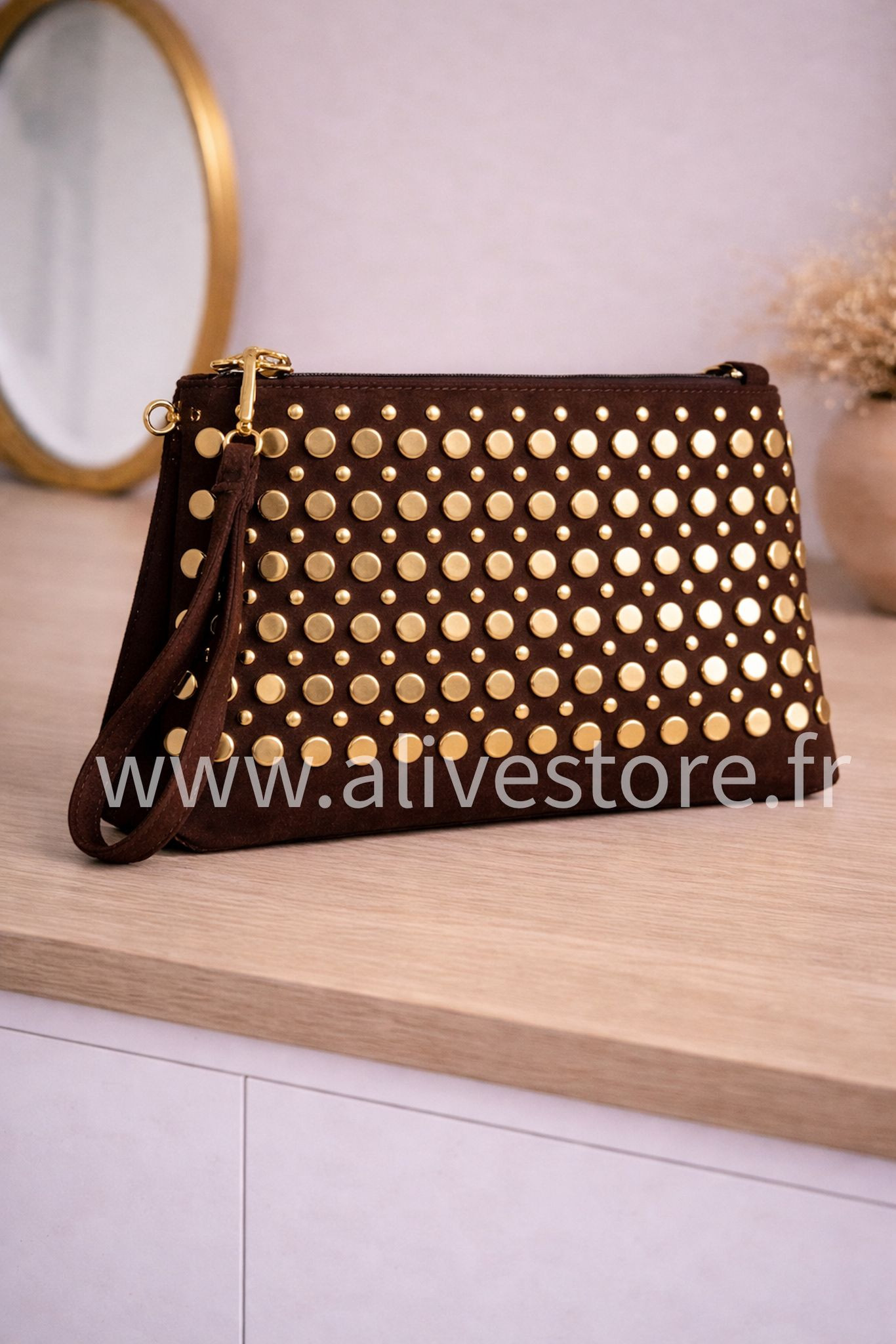 POCHETTE ÉLÉGANTE EFFET DAIM AVEC DÉTAILS CLOUTÉS DORÉS QUI APPORTENT UNE TOUCHE CHIC ET MODERNE